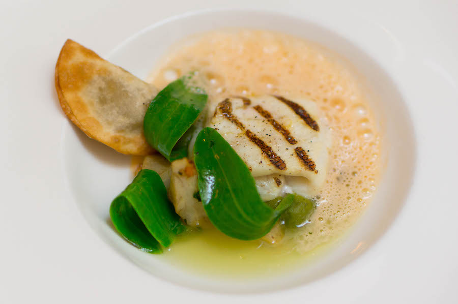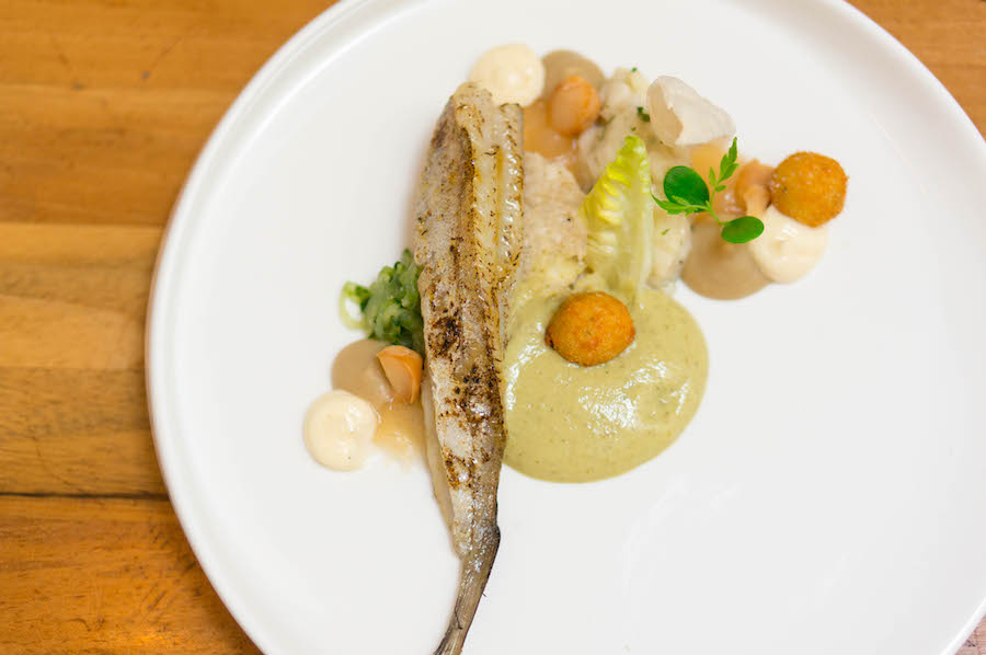 Vervolgens werd het tijd voor gang twee. Een Mexicaans geheel: een met bonen gevulde taco op een bedje van avocado en zwemmend in een zachte crème van parmezaanse kaas die wegsmolt op je tong. Is het heel onbeleefd om naar een re-fill te vragen? Het niet-vega gerecht bestond uit gegrilde scholfilet in een schuim van chorizo.