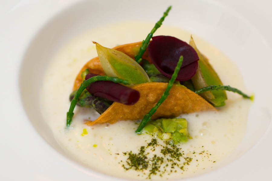 Zoals een zachte, frisse couscous van bloemkool (de truc van de chef: bereid de couscous met een beetje appel voor een fijn zuurtje) met een pittige mango-crème, geroosterde macadamia, krokante balletjes van gepofte aardappel met gekarameliseerde knoflook, ingelegde rode ui, cress van beukennootjes en Granny Smith.