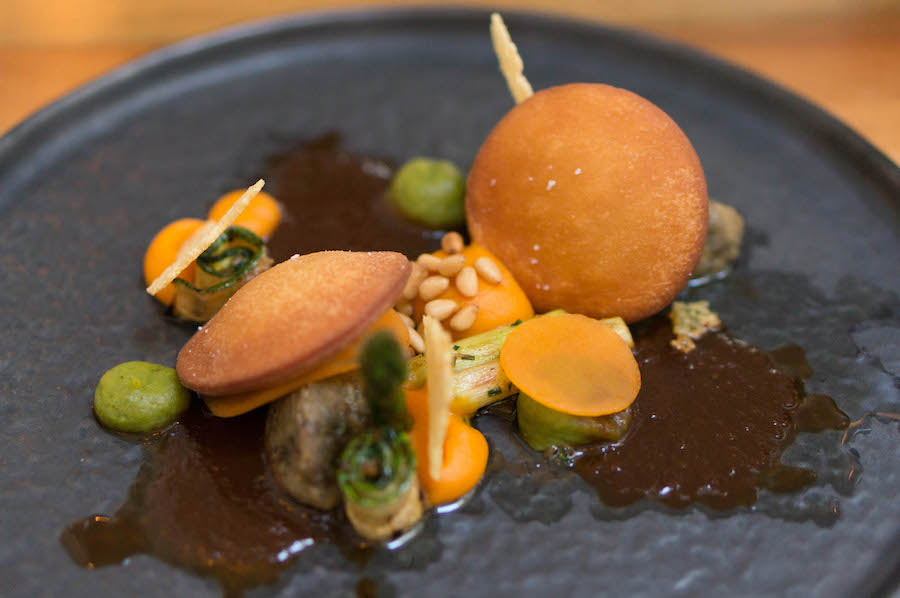 En als je denkt dat je het lekkerste hebt gehad, volgt er nog een gerecht waarvan je nooit had verwacht dat het bij elkaar zou kloppen. Krokante ravioli van brood met pompoen, truffel en hazelnoot, pijnboompitjes, krokante kaaskoekjes, asperge, crème van avocado en pompoen en een jus van gebarbecuede groenten met rode wijn. Daarvan maakt het hart van elke vegetariër een sprongetje.