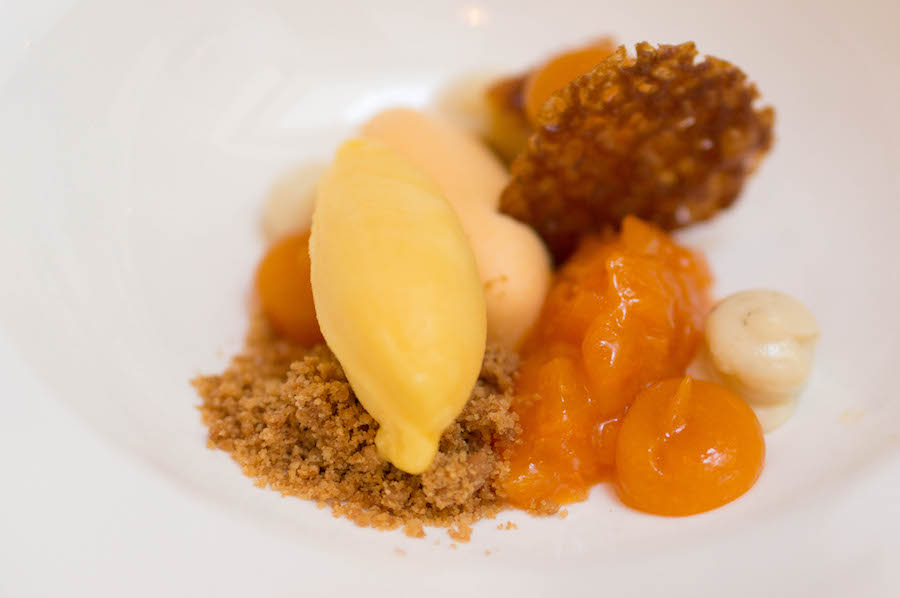 En ook voor het toetje bleven we nog even zitten. Een fris geheel met onder andere abrikoos, sticky toffee, crumble met citrus, crème van tonkabonen en passievrucht-ijs. Een toetje dat je opfrist en tegelijkertijd smaakt naar Sinterklaas (tonkabonen for the win!).