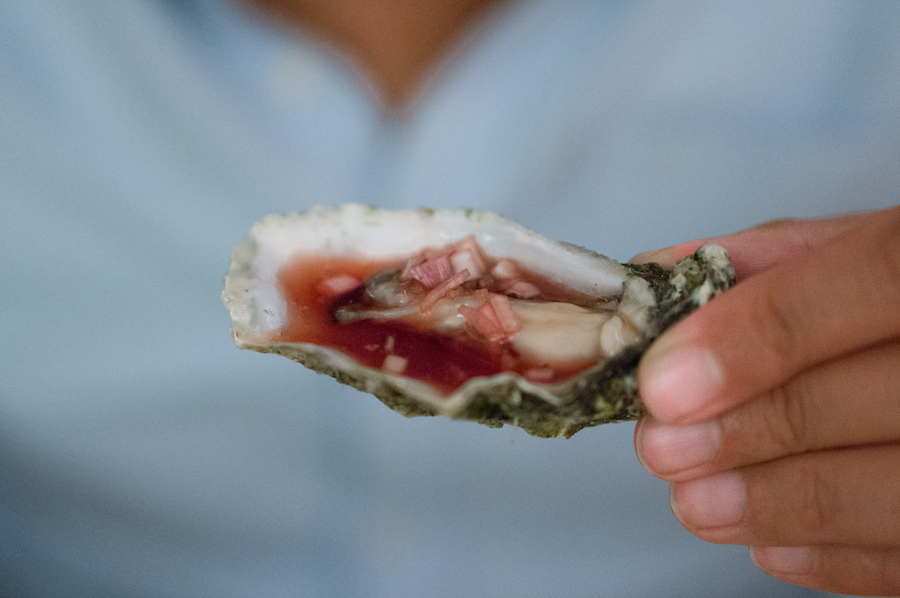 Maar eerst moet er geproost worden met oesters: twee Gillardau die heerlijk zilt en zoet zijn.