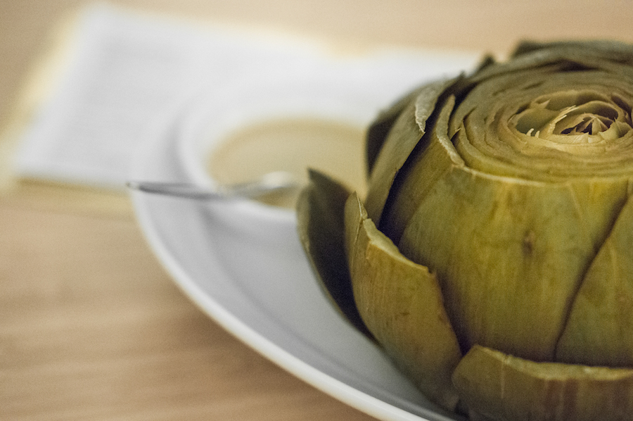 We kunnen haast niet kiezen van de kaart (te veel lekkers) en vragen de serveerster om raad. Toevallig noemt ze net een aantal gerechten die we zelf ook in gedachten hadden. Te beginnen met de artisjok met vinaigrette. Super Frans natuurlijk!