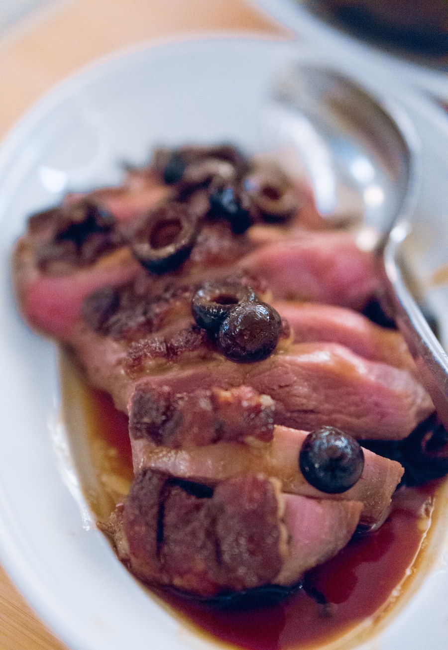Maar misschien wel onze favoriet is de eendenborst met zwarte olijf en saus van Xeres azijn. We gebruiken het hart van de artisjok – dat we na tips van de serveerster vakkundig uit de hele artisjok halen – om de rest van de saus op te dippen. Zálig.
