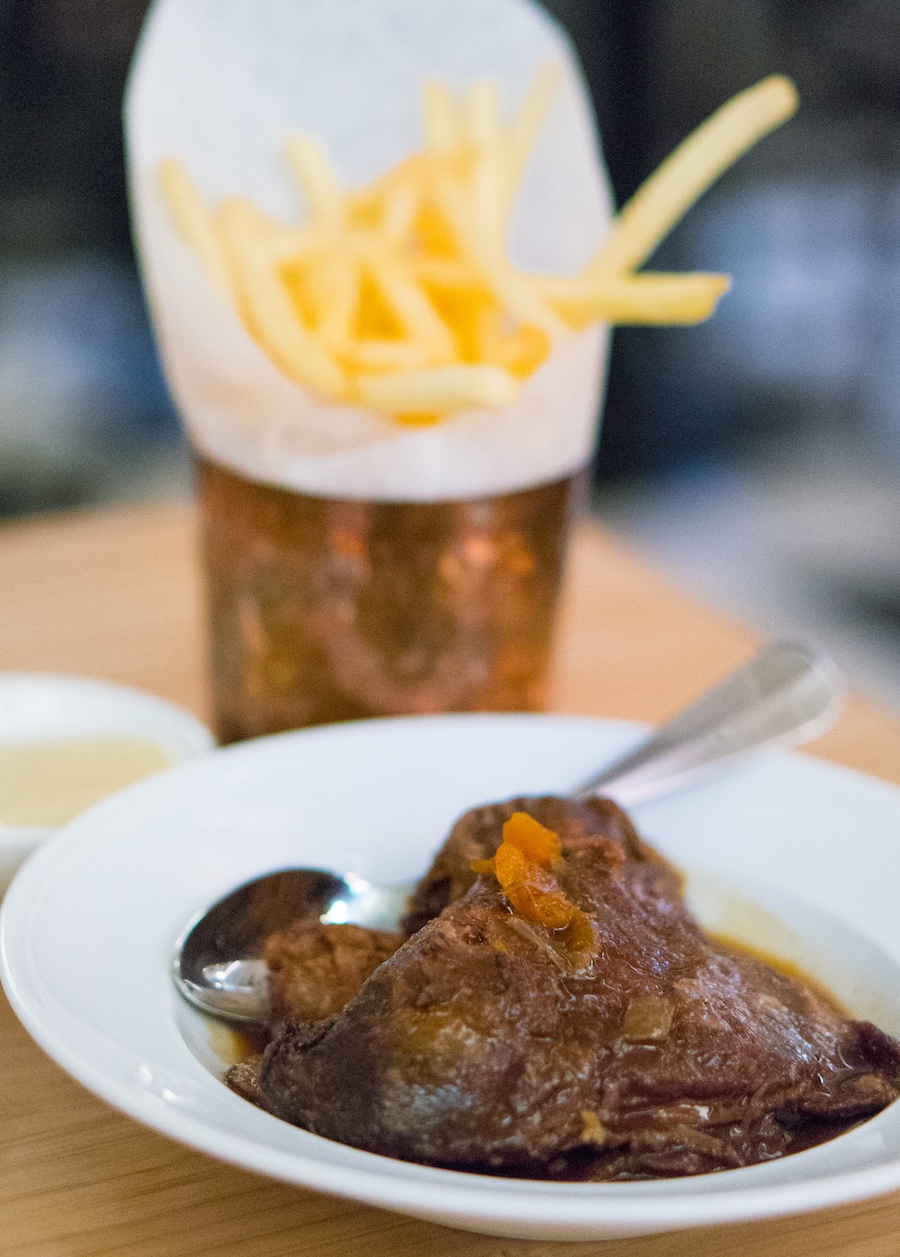 Na al die lekkere verschillende smaken en texturen gaan we voor comfort food op z’n Frans. Dus de gestoofde kalfswangen en Franse frietjes met mosterdmayonaise. De kalfswangen zijn heerlijk zacht van smaak en de saus doet haast aan als een lichte bolognese.