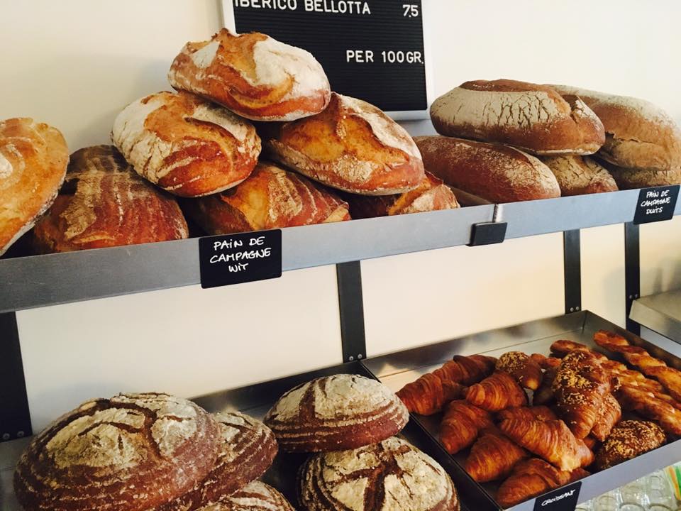 Boven de kassa prijken planken vol vers brood: van pain au chocolat tot aan croissants, saucijzenbroodjes en biologisch desembrood. Het brood is afkomstig van bakkerij Neplenbroek, die vóór de Familie van Rijk in het pand zat.