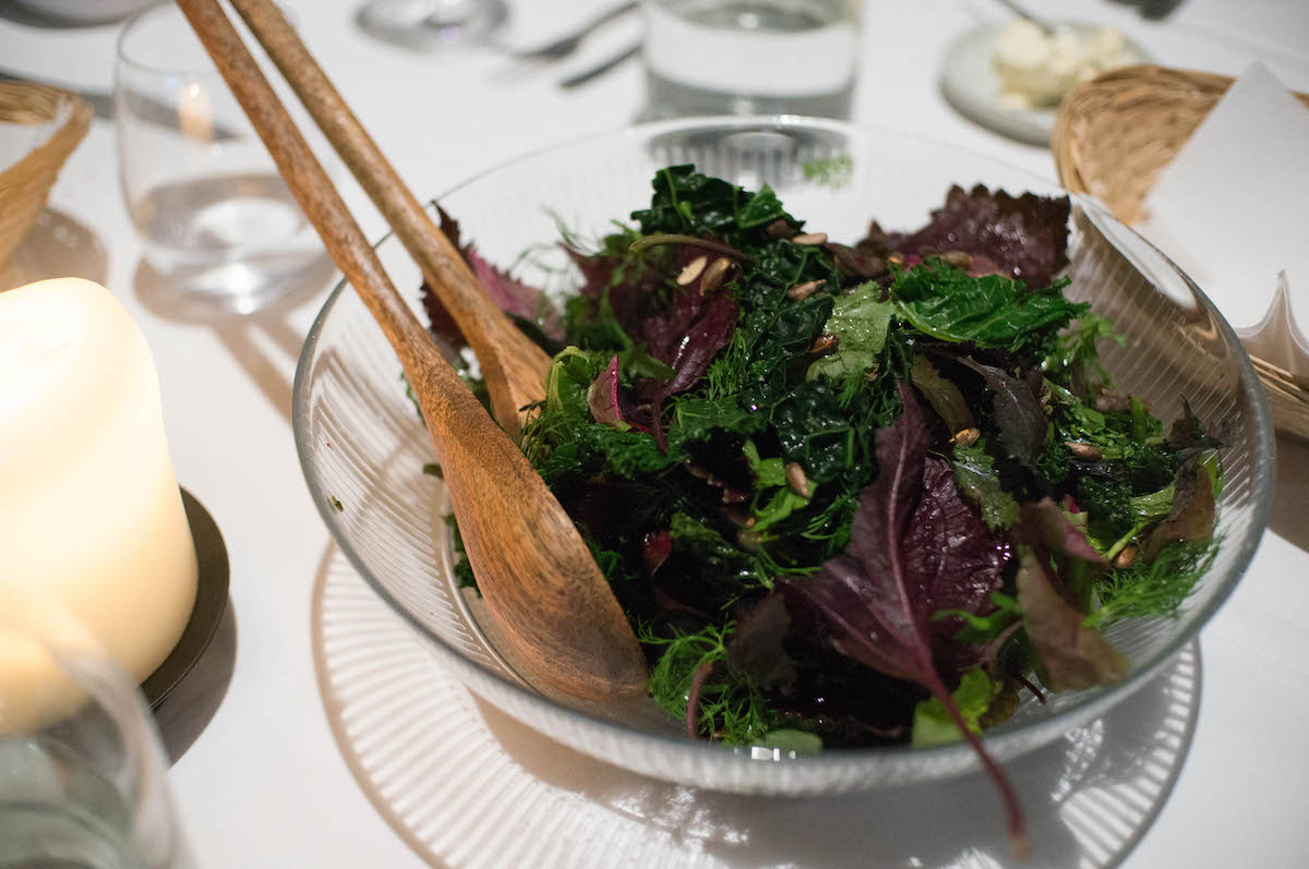 Iedereen eet hier hetzelfde (dieetwensen daargelaten), maar ieder krijgt een mooi opgemaakt bordje voor zich. We beginnen met een gerechtje van koolrabi, amandel, mosselen, makreel en bronzen venkel. Er wordt door chef Roy aan tafel nog een beetje amandelmelk bij geschonken. Geurig, fris, Hollands: mooi.