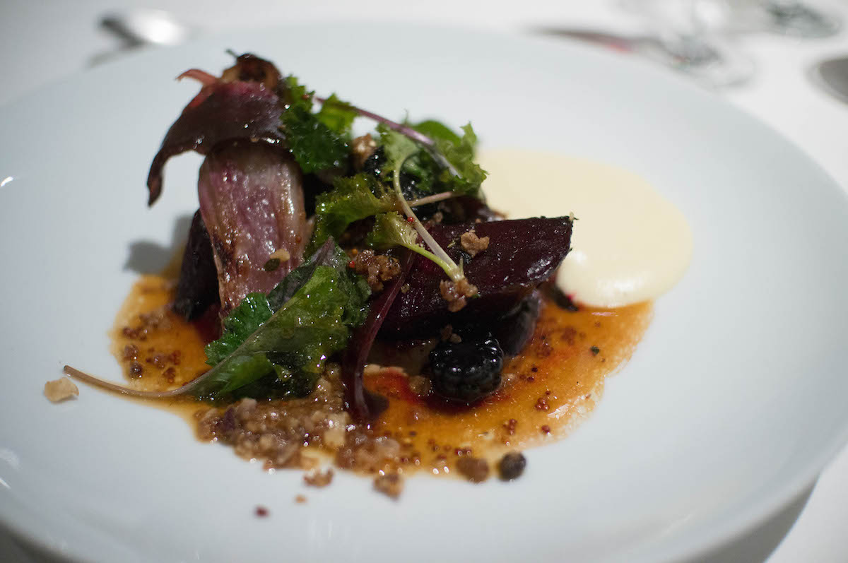 Als hoofdgerecht serveren de chefs wilde eend met biet, roodlof, kastanje, braam en zwarte mosterd. Te gek is de ham van eend bij het gerecht: zacht en zoutig, maar ook de crumble van de huid van de eend is tof bedacht. De friszure bramen snijden dwars door de aardse smaak van de biet heen. De gastvrouw van vanavond schept er nog een lekkere volle lepel aardappelmousseline bij. “Met maar een klein beetje boter… maar niet heus”, zegt ze haast zwoel.