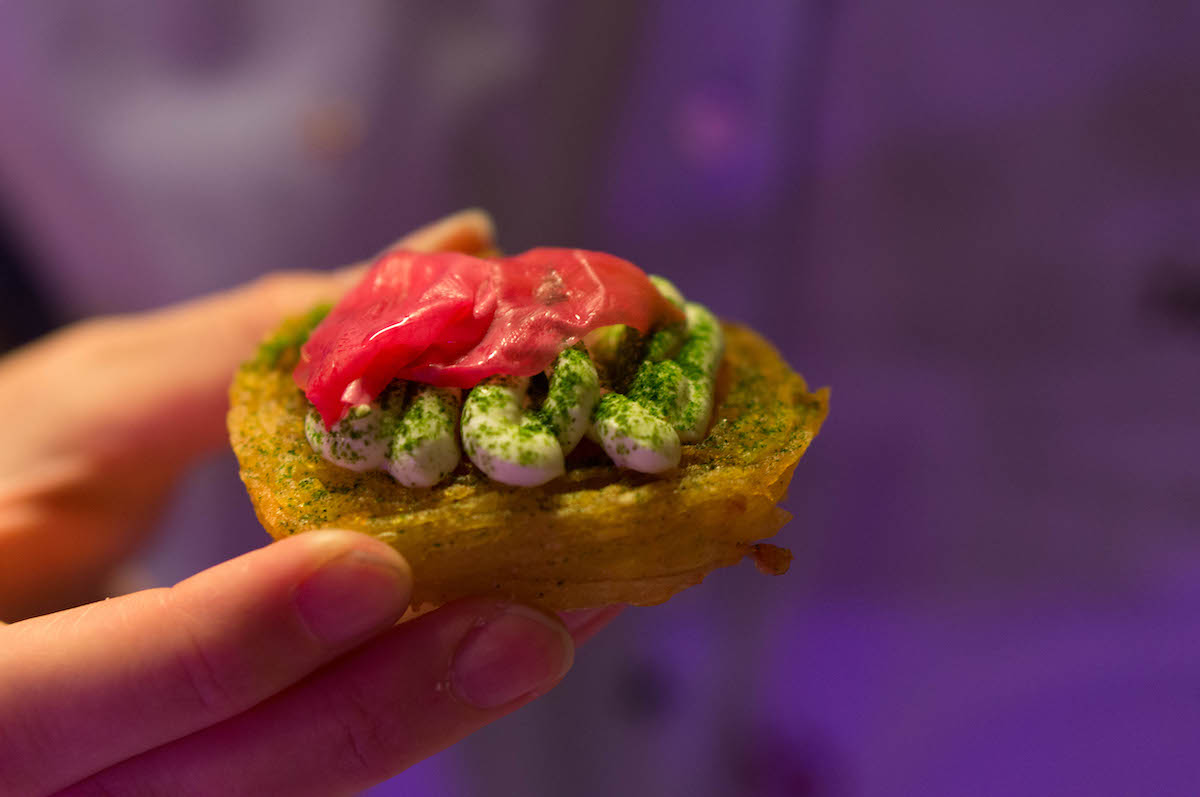 De chefs lopen daartussendoor met schalen vol heerlijke borrelhapjes. Knapperige gefrituurde spruitjes met kerrie. Toast met aubergine, boekweit en schapenkaas. Een krokant aardappelnestje met hangop en pickled rozenblad. En daarbij een glaasje cava met verveine en ceder citroen. Allemaal happen (en dranken) die de smaakpapillen doen ontwaken. Knapperig, fris, zuur, zoet, zout, bitter, zoet: alles komt voorbij.