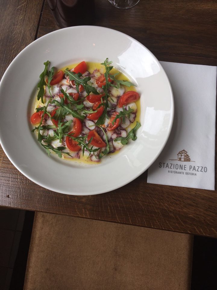 Bij Stazione Pazzo eet je een menu van 2 of 3 gangen (respectievelijk € 31,- en € 39,- euro). Traditioneel en klassiek, maar wel op niveau. Denk bijvoorbeeld aan carpaccio polpo e pomodori, dus carpaccio van octopus. Of agnello (lam) con gremolata. En er is ook lekkers in de vorm van focaccia pugliese (focaccia met aardappel), zelf ingelegde olijven en goddelijke antipasti.