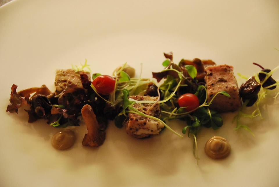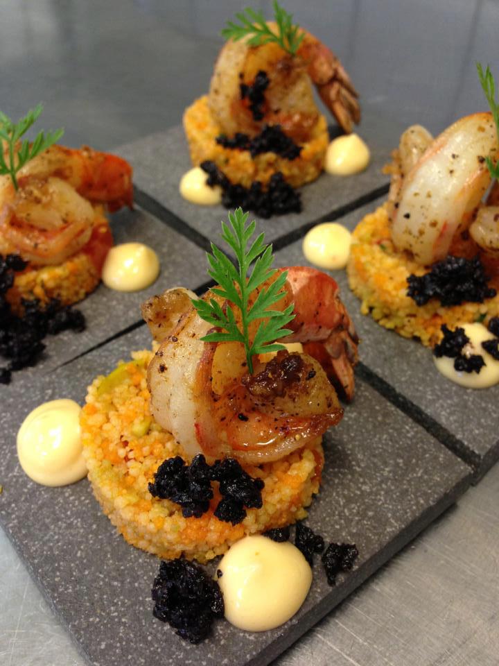Denk aan gerechten als hazenrugfilet met een crème van knolselderij, spruitjes, cranberries en saus met groene pepertjes. En als dessert klinkt de de savarin van witte chocola en abrikoos, gelei en krokant van koffie, poeder van nutella en bananenroomijs ons als muziek in de oren. O, yum…
