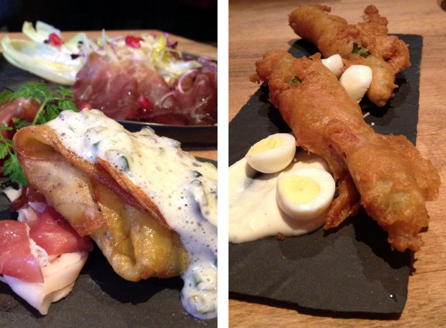 Les 5: Feest van Frituur. Onze favoriet van de avond is Les 7: Geen eitje, waarbij een gepocheerd ei (perfect zacht) in een pakketje van dunne aardappelschijfjes is gefrituurd. De bijzonder combinatie wordt geserveerd met gedroogde Livarham (Limburgs kloostervarken, gedroogd in de Sierra Nevada) en dragonsaus.