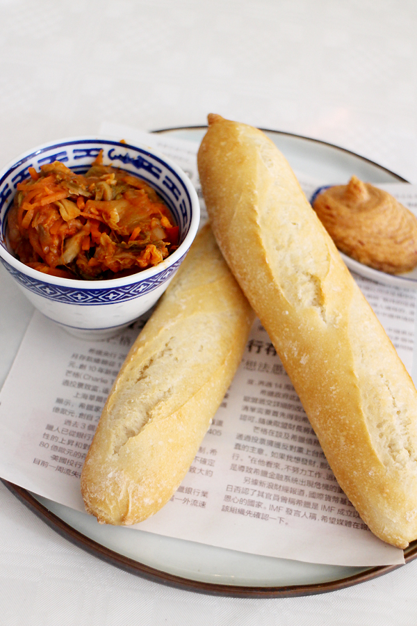 Vlak nadat we hebben plaatsgenomen aan één van de gezellige tafeltjes krijgen we een bordje met daarop twee (nog warme) mini baguettes, kimchi en vegetarische paté van sojabonen. Een leuk en vooral smaakvol begin.