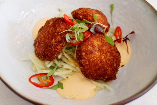 Erna volgen viskoekjes van zalm, koriander en yuzu, met daarbij een salade van papaya en meiraapjes. Minstens net zo smaakvol als de kimchi en zowel de koekjes als de salade zijn nog lekker crunchy.