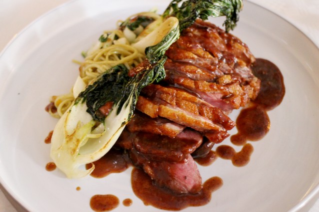 Dan het hoofdgerecht: geroosterde eendenborst met sinaasappel, noodles en bok choy. De beloofde shiitakes en bamboescheuten zijn helaas ver te zoeken en verder is het gerecht ook een beetje saai. Het is zeker lekker, maar niet zo bijzonder als de rest.