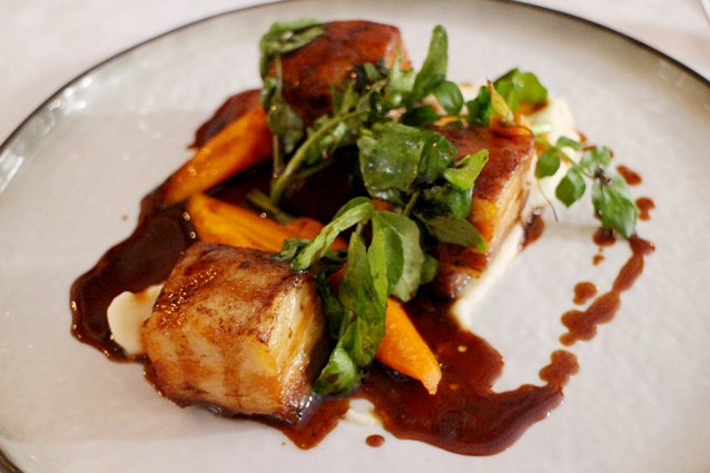 Wat wel bijzonder is, is het buikspek met knolselderijpuree, worteltjes en teriyakisaus. Een prachtige samenwerking van Frankrijk en Azië met de heerlijk zoutige teriyaki en fluweelzachte puree. Het gerecht gaat helemaal op en als niemand kijkt nemen we zelfs nog een paar likjes van het bord. Yum!