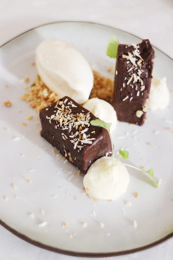 Hoewel de porties vrij ruim zijn, besluiten we toch nog voor een toetje te gaan. We delen er twee en dat blijkt een goede keuze. De chocoladeganache met vanilleroomijs en dotjes goddelijke kokoscrème gaat op tot het laatste stukje en ook het lychee-ijs met frambozenmousse is waanzinnig!