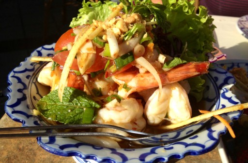 De keuze aan gerechten is groot, waaronder de bekende curry’s, diverse Phad Thai varianten en een brede keuze aan vis, kip, rund en vegetarisch. Bij BaiYok zijn bovendien het merendeel van de gerechten gluten- en lactosevrij. Om de keuze tussen zoveel lekkers te vergemakkelijken, zijn er verschillende menu’s samengesteld. Wij gaan voor het zomermenu, waarbij we starten met een combinatie van verschillende gerechtjes. Een loempiaatje, saté van kip en van runderhaas, een garnalenkoekje en in pandan-blad gebakken kip. Drie dipsausjes maken het smaakvolle voorgerecht af.