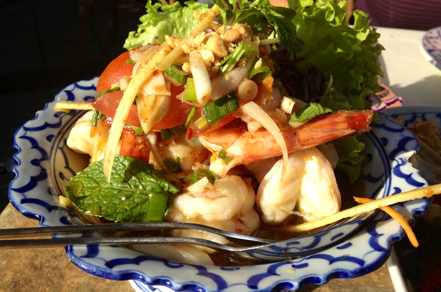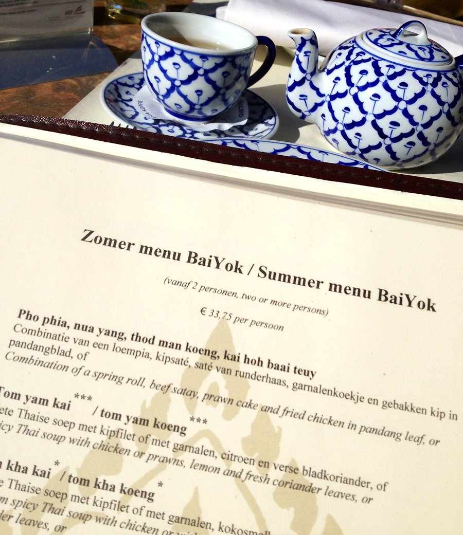 Waar sommige restaurants in zwaar weer zitten door de crisis, hebben anderen daar klaarblijkelijk geen last van. Op een gewone woensdagavond zit het verrassend vol bij BaiYok. Zowel binnen in het restaurant als buiten op het terras aan het water zijn de tafels bezet. We nemen plaats in de zon en kijken onder het genot van een potje thee naar de menukaart.