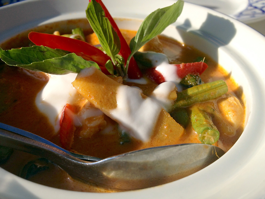 In het zomermenu worden drie hoofdgerechten geserveerd: een pittige rode curry met kip, krokant gebakken stukjes pangasiusfilet en een koude salade van grote garnalen met rode ui, citroengras en koriander. Een grote schaal witte rijst vergezelt de verschillende smaken en verlicht te pittige curry (indien gewenst). De versheid van de ingrediënten zorgt voor zoveel smaak dat je blijft eten in de flinke porties. Een ijscoupe met sorbetijs sluit het menu en de avond op een frisse manier af. BaiYok is een heerlijke aanrader voor liefhebbers van de Thaise keuken, wij komen graag terug!