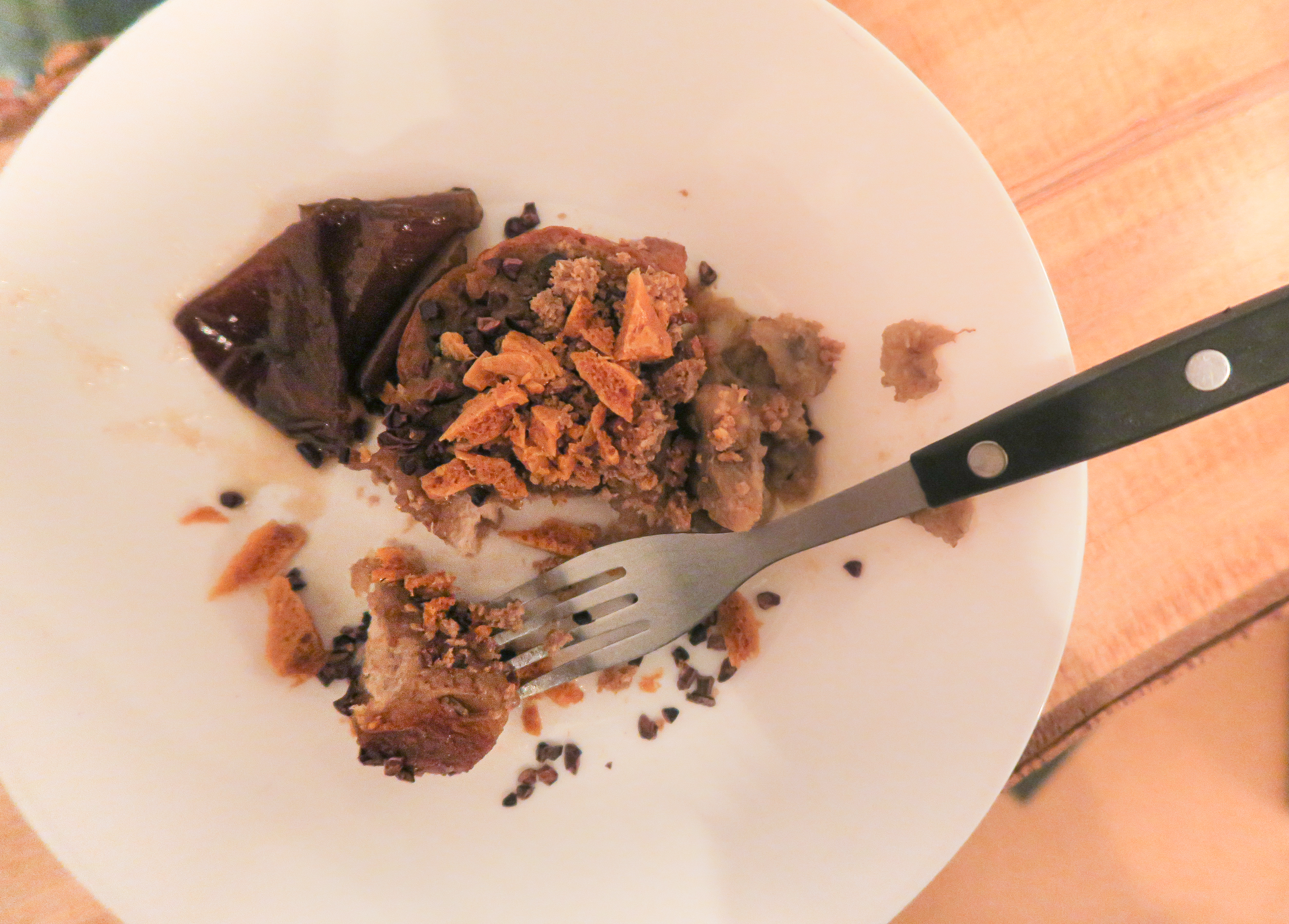 Het dessert bestaat uit gebakken suikerbrood met bananenpuree met whiskey, gekarameliseerde bananenschil, cacao nibs en gezouten karamel chunks. Dit is er één om te onthouden (en misschien zelf na te maken van je left over banana peel).