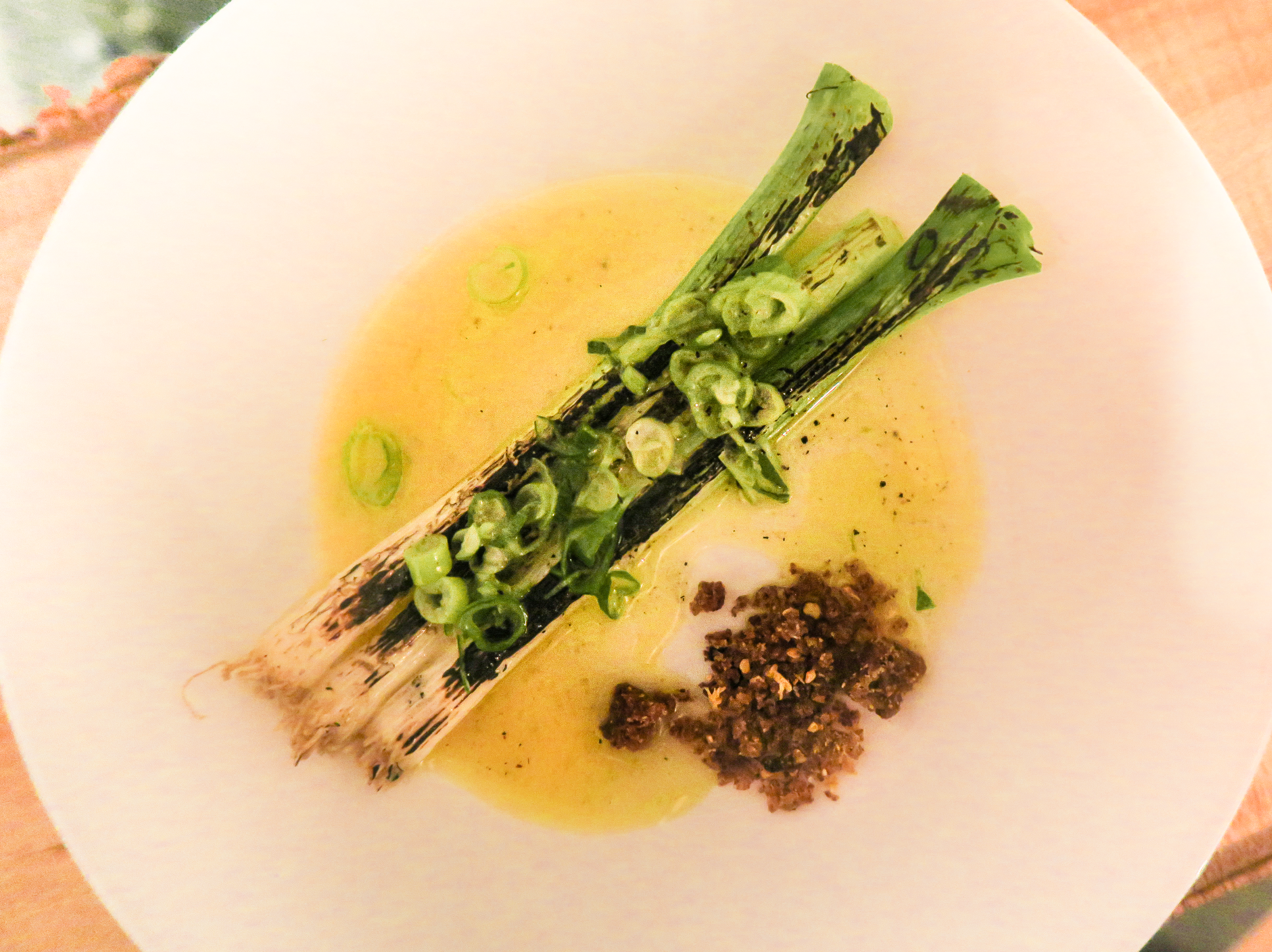 De smaak van de gebrande bosui is top. Een licht en simpel gerecht, een perfecte start van het menu. We laten de kontjes van de bosui liggen, maar als Bryce onze borden komt afhalen, wijst hij ons erop dat je de kontjes ook gewoon kan eten. Dus dat doen we.