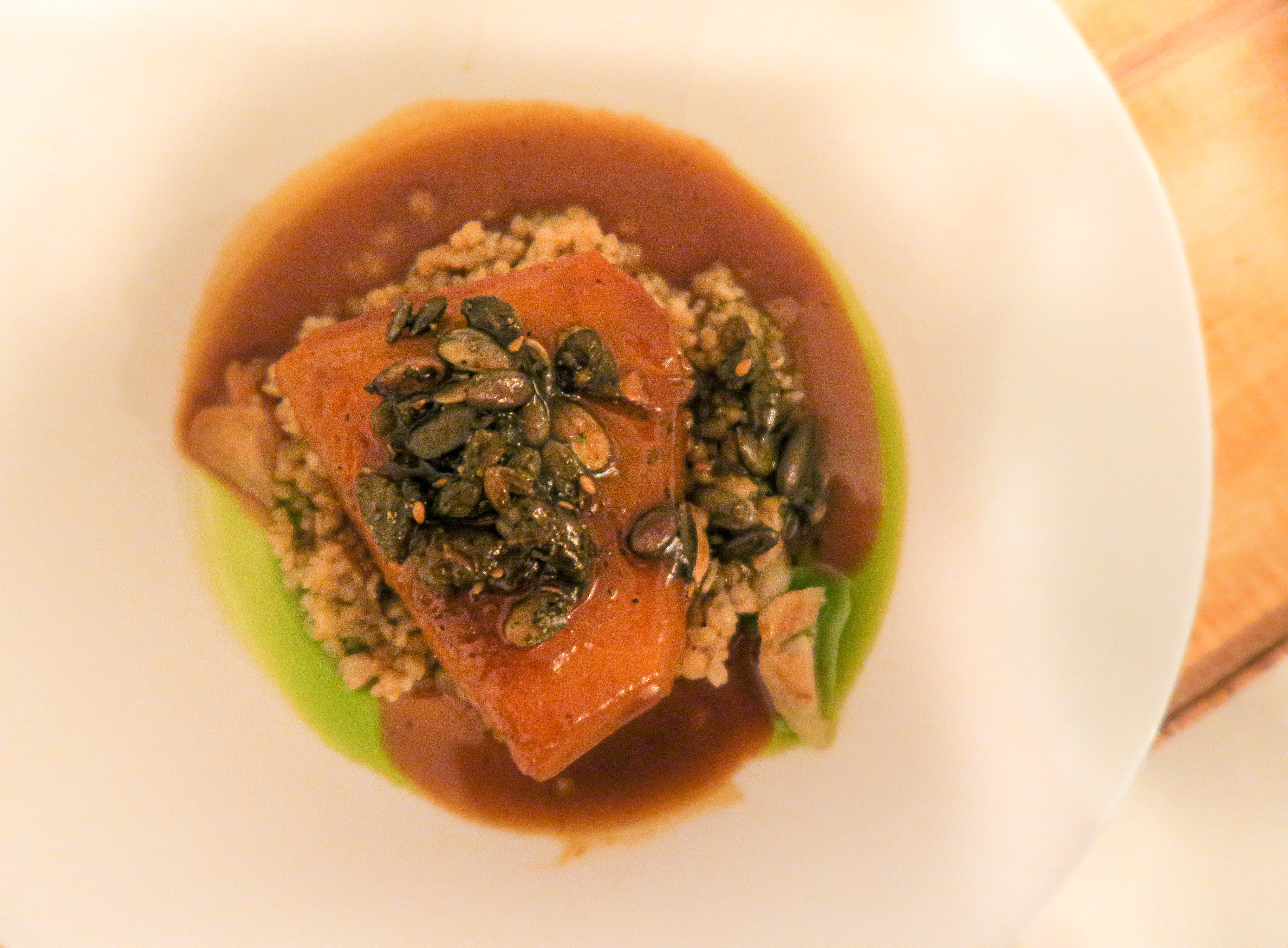 Wat volgt, is een gerecht met gestoofde pompoen op een bedje van bulgur. Daaronder wederom de bouillon van heilbot en een saus van de schillen van dezelfde pompoen.