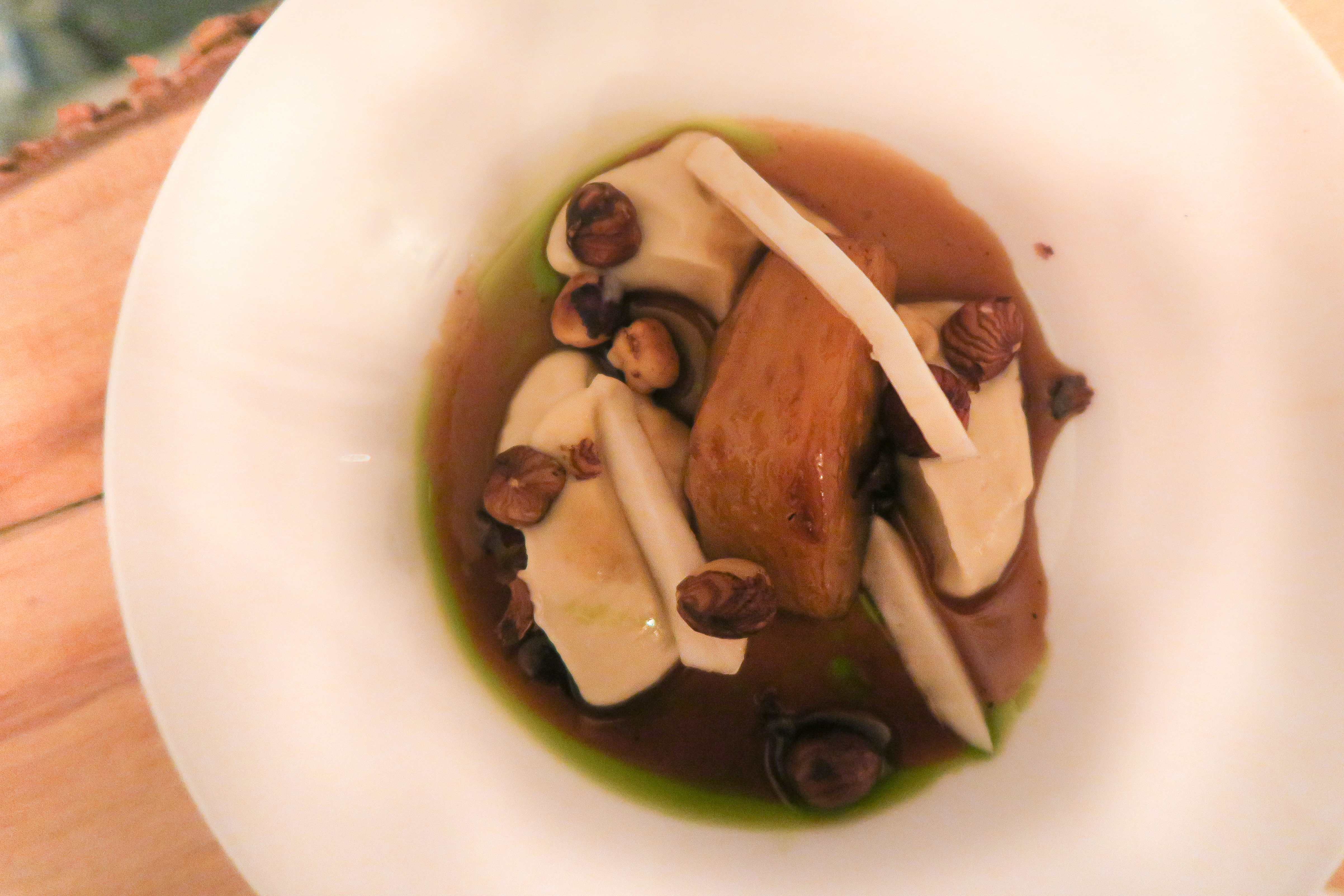 Bryce is lekker in de weer om het volle restaurant te voorzien van al het circulaire eten. Als hij ons het volgende gerecht brengt, vertelt ‘ie dat het allemaal van knolselderij is met daarbij hazelnoten en groene olie, en vervolgens sprint ‘ie weg om terug de keuken in te duiken.