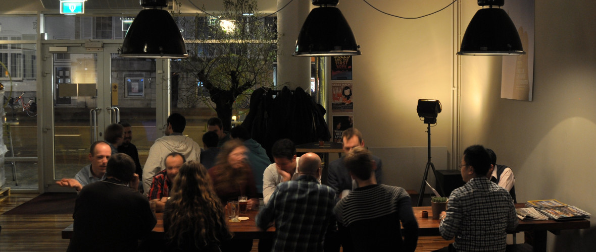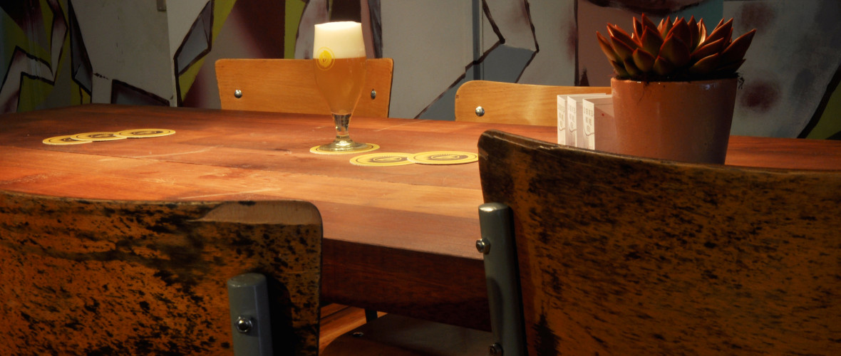Ik neem plaats aan de bar op de eerste verdieping. Het blijkt dat ik bovenop het bier zit, want in de kelder zit de brouwerij van Van Moll, waar bieren worden geboren als Rode Aarde, Conquistador en Ons Blackie.Naast mij zit de bierbrouwer van Van Moll. Helaas zit er geen vriendelijke conversatie in het biervat vanavond. Dus ik focus mij op de bierlijst. Een waterval aan namen prikkelt mijn smaakpapillen: Lief & Leed, l’Enfant Terrible, Rubberen Robbie.