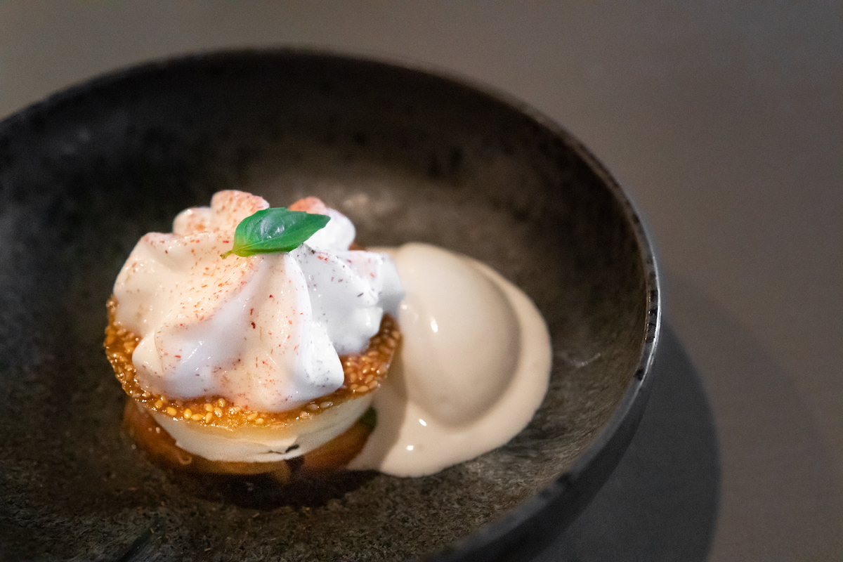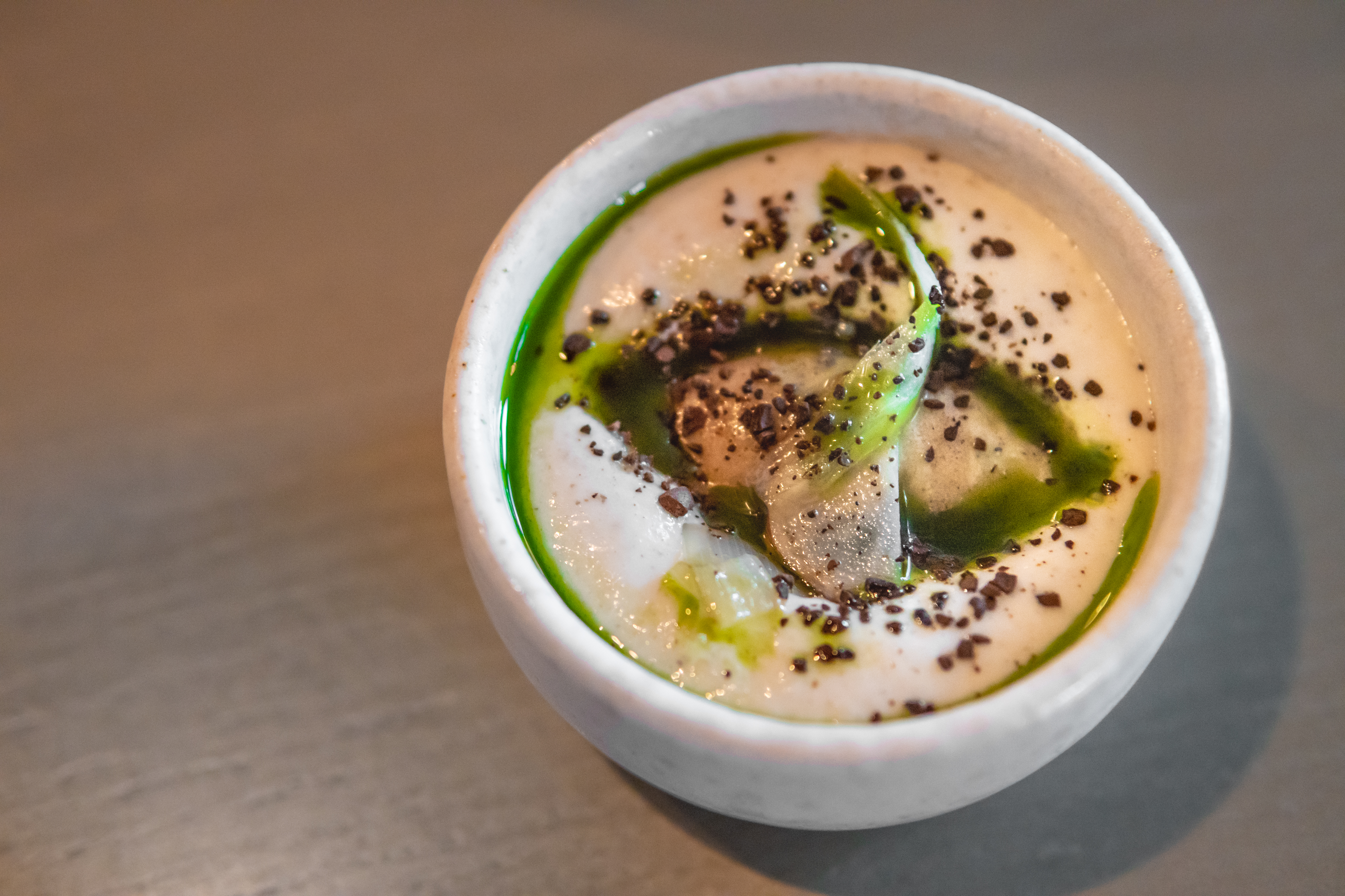 Dat feestgedruis zetten we voort met het volgende gerecht, dat bestaat uit aardpeer, koffie en gember. We krijgen een kommetje met daarin schuim van aardpeer, gekarameliseerde ui en poeder van koffie. Net als je de hemelse combinatie aardpeer, ui en koffie keihard zit te bewonderen, krijg je opeens een hint van ingelegde gember door. Een soort sushigember, maar dan op steroïden. Dit gerecht is een van de beste dingen die we de afgelopen tijd hebben gegeten.