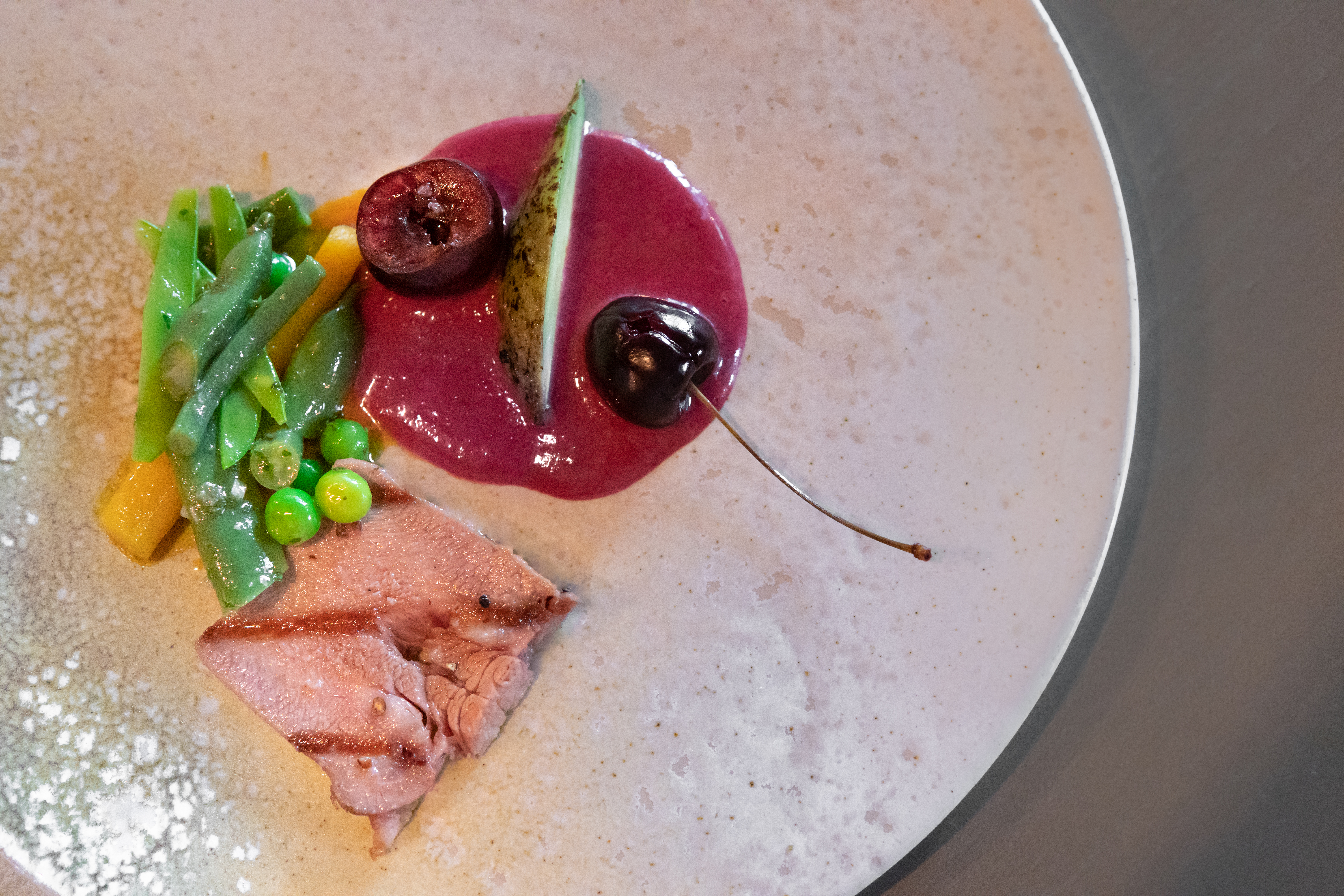 Dan verschijnt de kalfstong met kersen: in een gazpacho en gepekeld, met gebrande avocado en snijbonen uit Noord-Holland. Als je geen kalfstong eet, ben je gek – zo vinden wij. En dat blijkt maar weer eens uit de hemelse, zachte bereiding van het stukje vlees dat we hier krijgen.