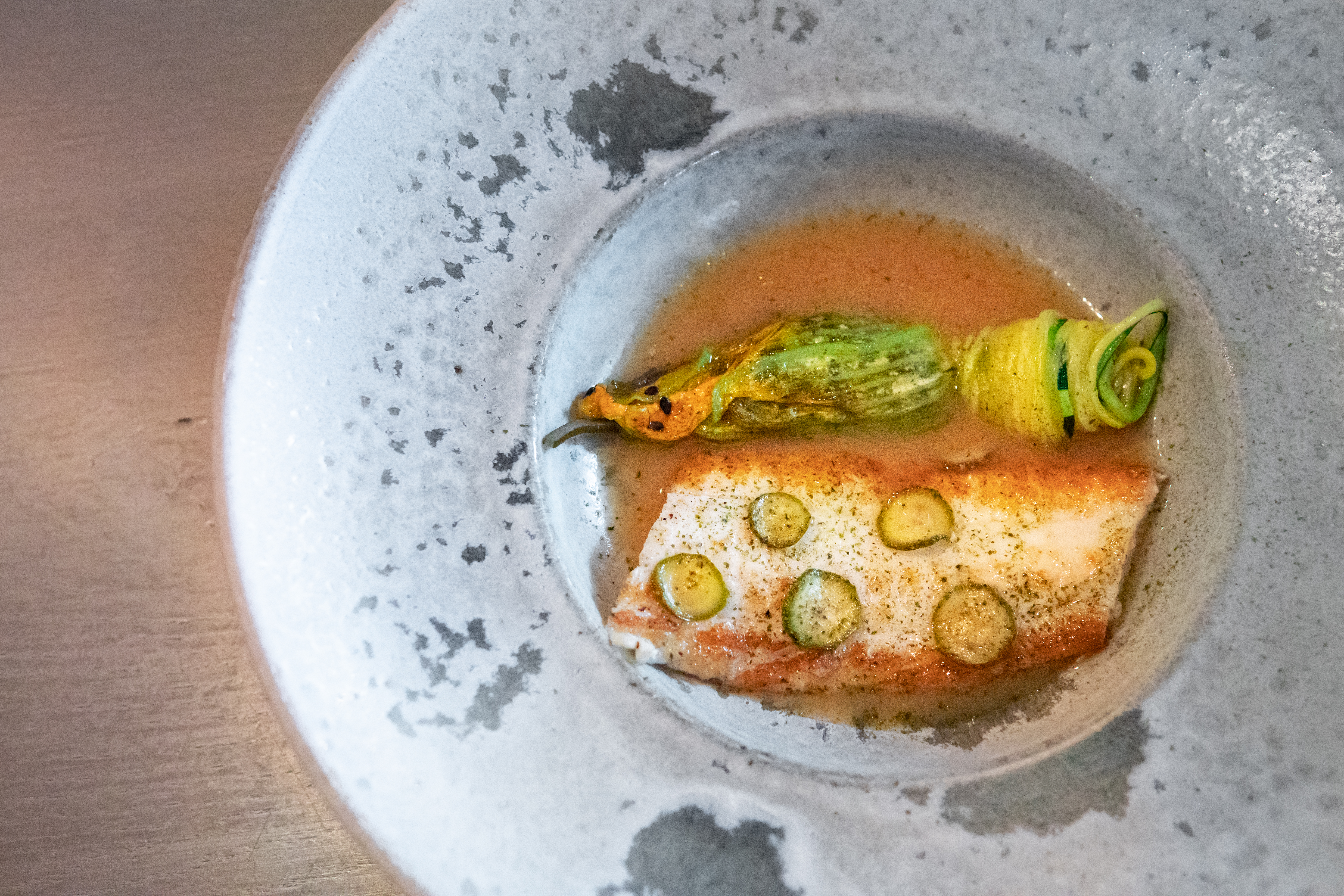 Dan de schol met plakjes gepekelde courgette. Eromheen bouillon van de vis en een courgettebloem gevuld met zeewier. De bouillon smaakt bijna dashi-achtig, heel lekker, en dan hebben we ook nog ergens een hint van mosterd die als een scherp mes door de rijke, zilte smaken van de vis en de bouillon heen snijdt. Het geheel gaat prachtig samen met de Assyrtiko uit 2016: een zilte, Griekse wijn uit Santorini die erbij wordt geschonken.
