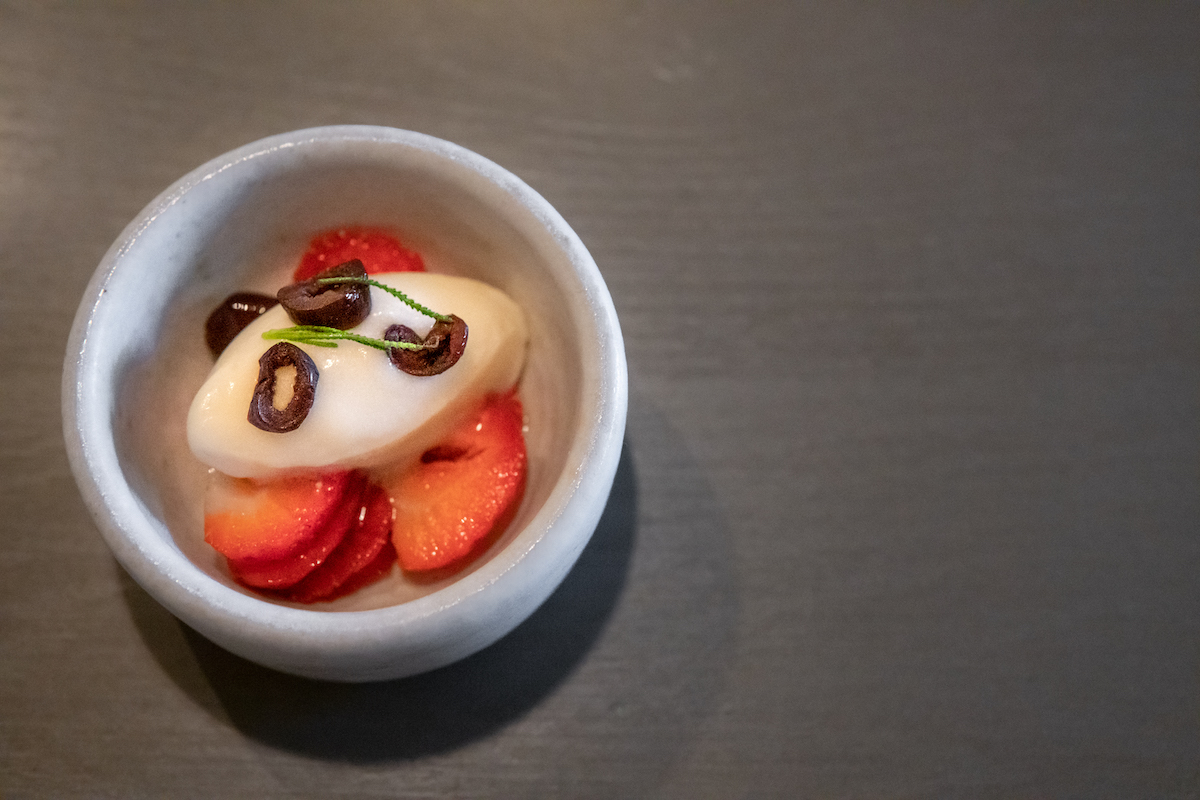 Voor het dessert krijgen we nog een pre-dessert waarin aardbei en zwarte olijven met elkaar worden gecombineerd. Je zou het in je stoutste dromen nog niet kunnen verzinnen, maar het werkt fantastisch samen.