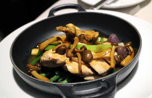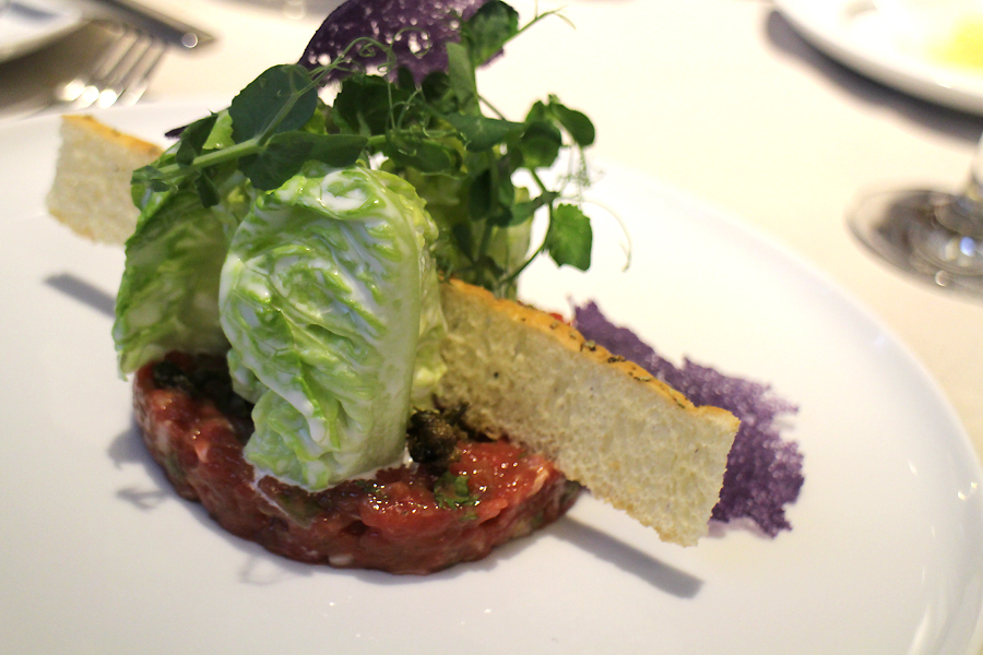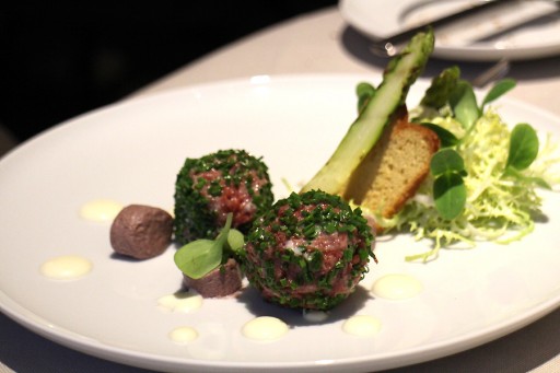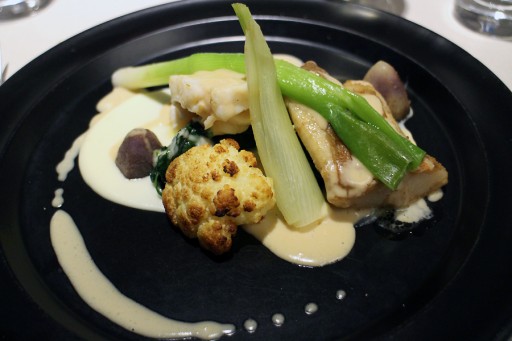 Dat is ‘m gelukt. We eten er heerlijk: ossenhaas tartaar, bijvoorbeeld, en rilettes van kalf met mousse van violetmosterd, groene asperges en krokant briochebrood. Deze voorgerechten zijn aan de prijs (€17,50), maar een driegangendiner, inclusief twee glazen wijn, is een stuk schappelijker: dat doet € 39.50 per persoon. De pot au feu van parelhoen met gesmoorde groenten en paddenstoelen is goed op smaak en prachtig gepresenteerd: niet als een rommelig potje, maar elegant en gebalanceerd. De zacht gegaarde zeeduivel heeft een garing waar je U tegen zegt: prachtig stevig.
