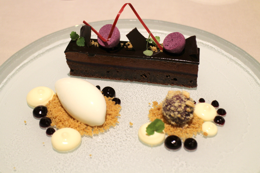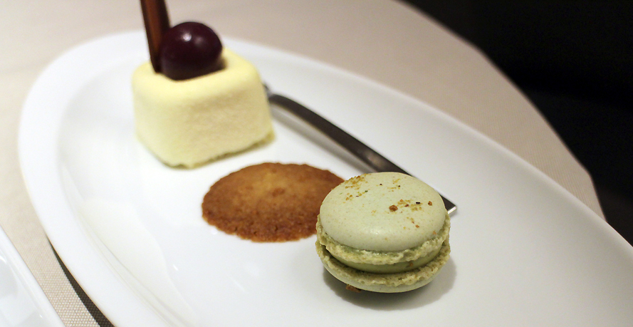 Ook de desserts zijn bijzonder goed uitgevoerd – dit restaurant heeft drie patissiers in dienst, en dat is te proeven. Het taartje van pure Maracaïbo chocolade met blauwebessencrème en amandelroomijs is een plaatje om te zien en een feestje om te eten. De Café Gourmand (Brabanders zouden het ‘aangeklede koffie’ noemen) evenzo: de macaron is subliem.
