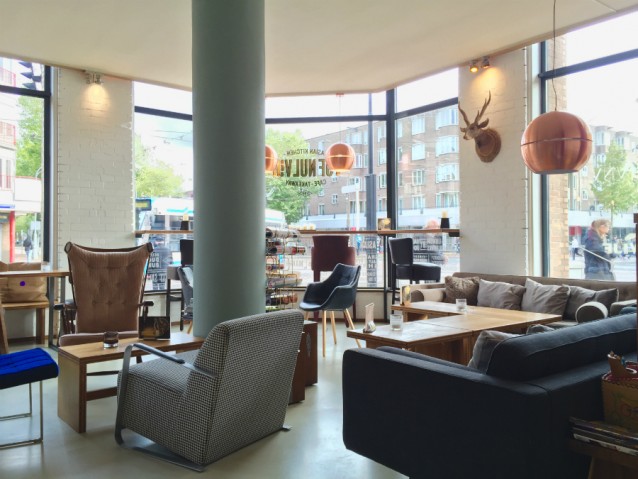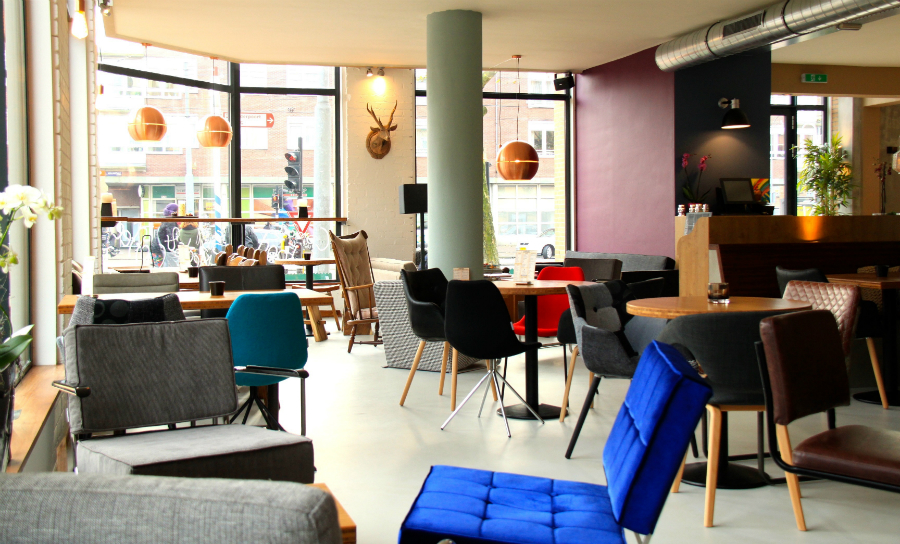 Het interieur is een bonte mix van (imitatie) designstukken, maar door de verschillende kleuren, de prachtige lichtinval en vriendelijke bediening voelt het alles behalve koud aan.