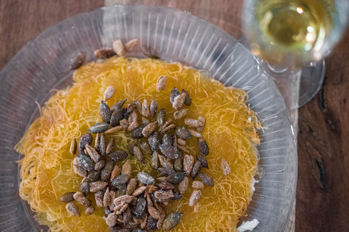 Na deze heerlijke hartige gerechtjes komt Irit vragen of we van geitenkaas houden. De tafelgenoot zeker, maar uw Culy-reporter past. Daarom krijgen we twee verschillende desserts. Alleerst knafeh: een vrij hartig, warm dessert van kataifi met geitenkaas en ricotta. Daarop gekaramelliseerde zaden. Het zit een beetje tussen een kaasplankje en een gebakje in en is een Arabisch gerecht.