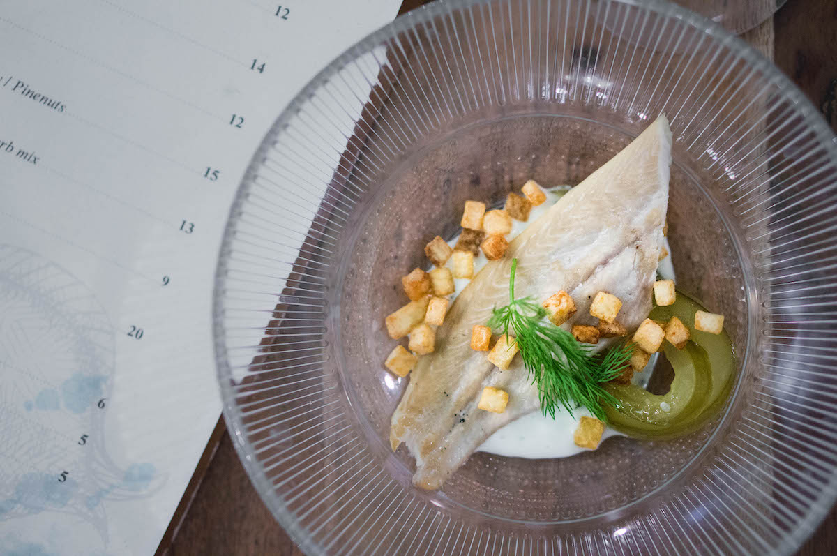 Daarbij eten we een amuse van gerookte forel met ingelegde pepers, dille, kaantjes van aardappel en vinaigrette met citroen. Een zalig begin waardoor we ons nu al helemaal thuisvoelen bij Bar Fisk.