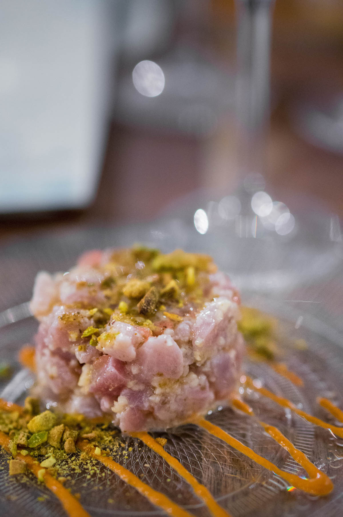 Het voorgerecht bestaat uit tonijntartaar met grapefruit en bulghur; die zijn beide door de tartaar vermengd, waardoor het gerechtje een lekkere bite krijgt. Over het bord strepen hete pepersaus (zhoug noemen ze die), pistache en korianderzaad en arganolie. Het gerecht heeft vooral ook hele lekkere texturen; het is zowel crunchy als smeuïg en chewy. Dit kunnen we elke dag wel eten.