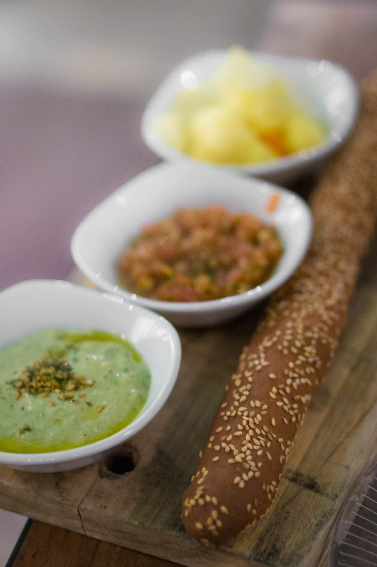 Bij Bar Fisk krijg je ook altijd versgebakken brood op tafel: Jerusalem bread, geïnspireerd op de Jerusalem bagel maar dan langwerpig, met daarbij dips en pickles. Het brood is nog lekker warm en knapperig. Lekker met de huisgemaakte tahini en tomatensalade. Ook de pickles zijn top.