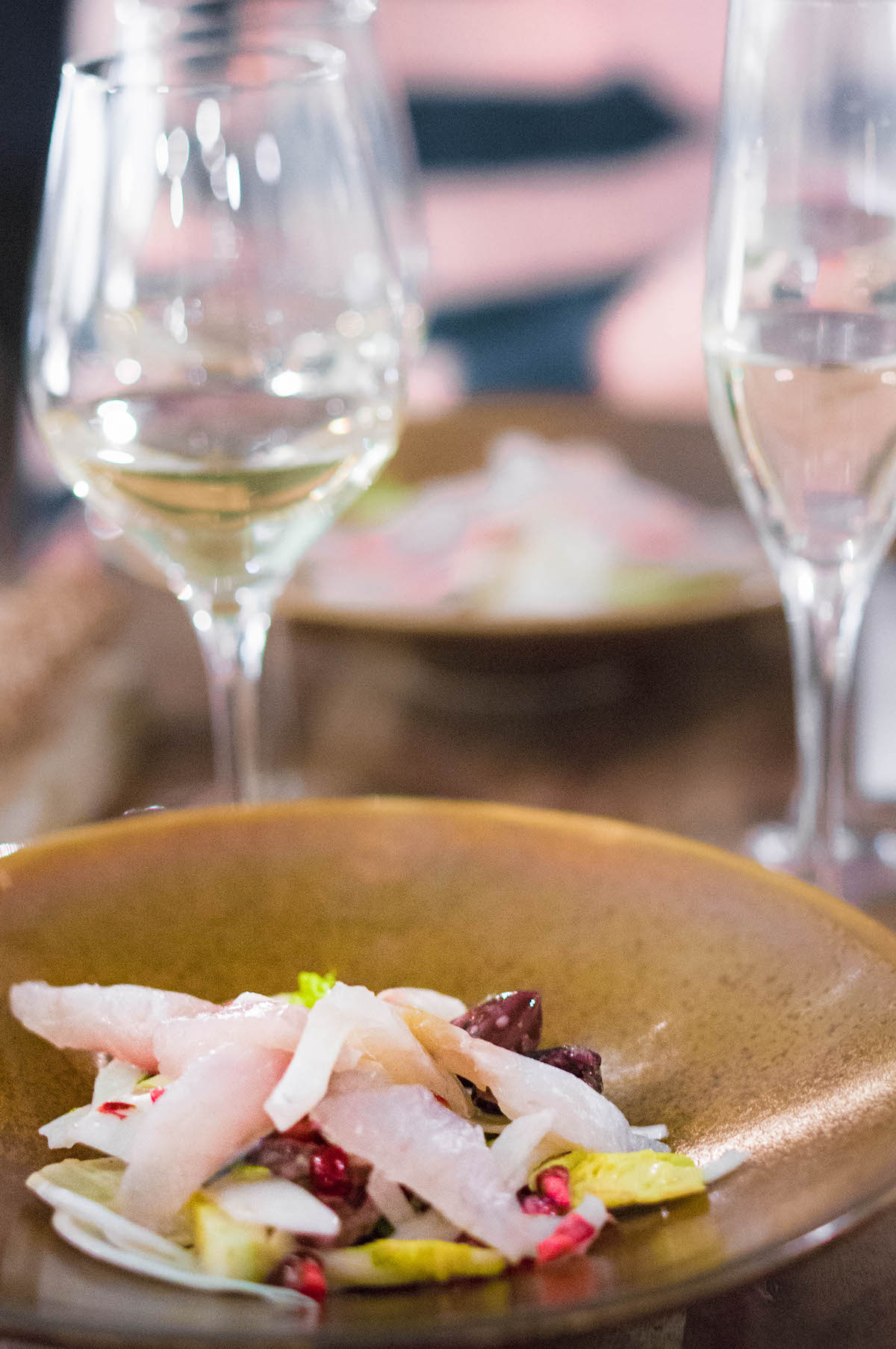 We krijgen in zout ingelegde zeebrasem met venkel, granaatappel, kalamata-olijven en baby gem. Mooie smaken: het zoute van de vis en de zuren bij elkaar, de wijn maakt het mooi rond. Het is geen ceviche, maar door de smaken doet het gerecht er wel aan denken. Wij dopen dit tot een Israelische ceviche.