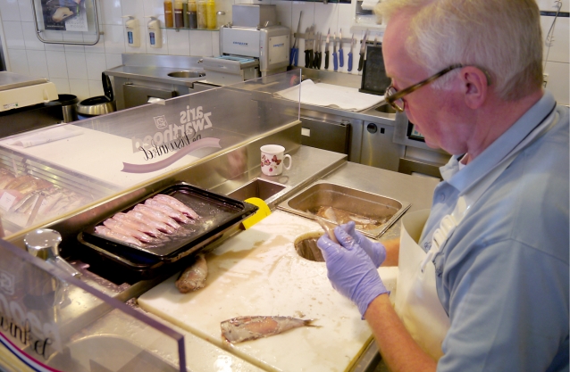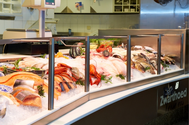 We stappen binnen in een zeer moderne viswinkel waarbij de lange, fraaie toon-koel-bank meteen in het oog springt. Gevuld met een breed assortiment vis. Navraag leert dat eigenaar (derde generatie) Aris Zwarthoed elke dag op zoek is naar vis van buiten de gebaande vispaden. En dat zie je dus.