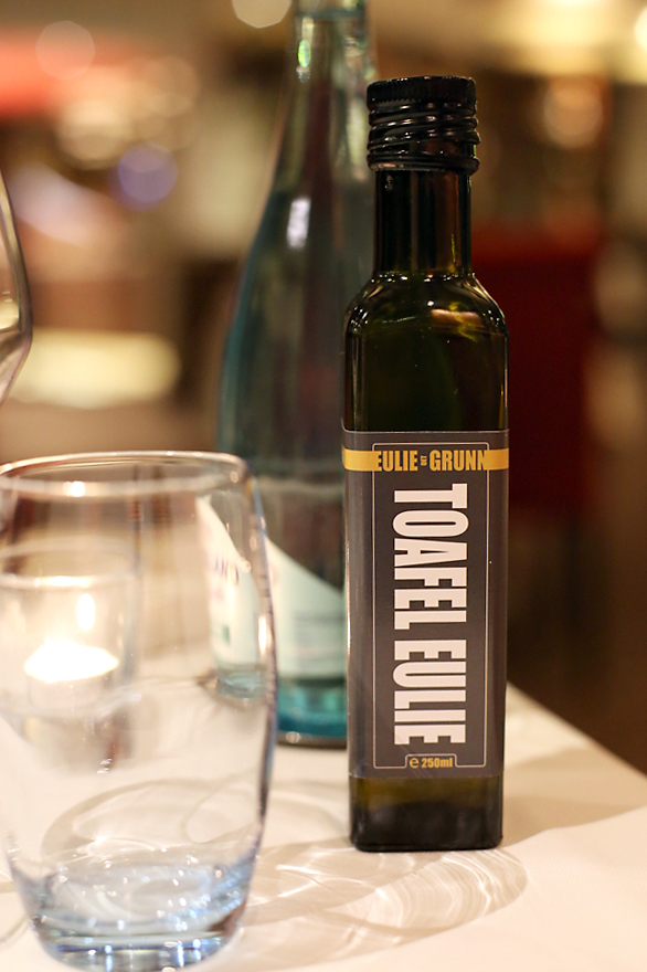 Zo begonnen wij de avond met brood, geserveerd met een flesje Eulie oet Grunn. Geen extra vergine olijfolie, zoals normaal op tafel staat, maar lokale koolzaadolie uit het Groningse Stadskanaal. Net iets milder en notiger dan olijfolie: wij zijn direct fan.