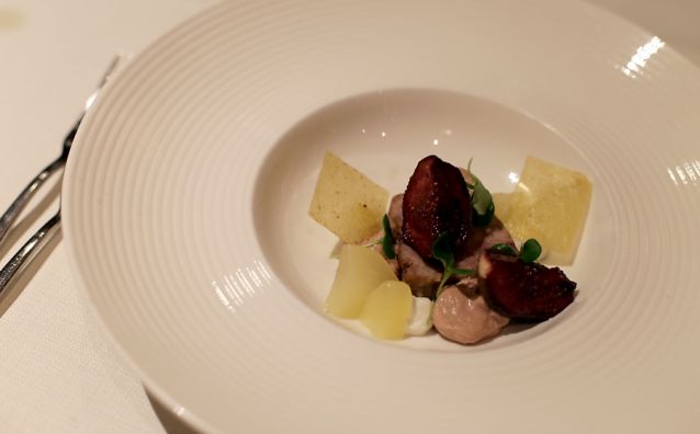 Terug naar het restaurant. Chefkok Stefan Steinigeweg en zijn team bereiden en serveren hier gerechten van de kaart die elk seizoen wisselt. Zo genoten wij van een voortreffelijke eendenterrine met peer van Molema (de boerderij van Ankie en Wirtjo Molema uit Nieuwolda), vijgen en Alambiek-likeur.