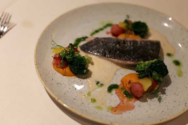 Totaal niet Gronings is dan weer de in dashi bouillon gegaarde corvinafilet met zoete aardappel, kimchi van radijs en takuan (ingelegde gele rettich uit Japan). Niet lokaal, maar wel erg smakelijk.
