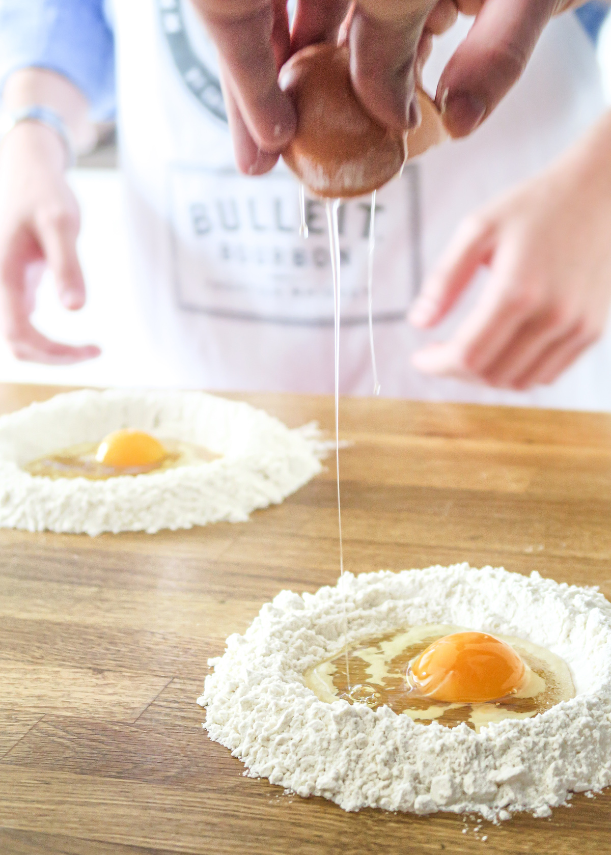 Met z’n allen gaan we onder leiding van Umberto aan de slag om onze eigen pasta pesto te maken met tagliatelle. We nemen plaats in de ruime en gezellige keuken en krijgen allemaal ons eigen bakje bloem en een ei: de ingrediënten om tagliatelle (maar ook ravioli, papardelle, lasagnebladen, etc.) mee te maken.