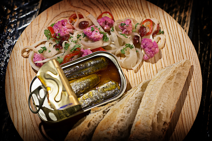 Denk bijvoorbeeld aan sardientjes uit blik (€ 8,-), maar ook ingeblikte scheermesjes (€ 16,50,-), kokkels (€ € 8,50,-) en venusschelpen op zeewater (€ 25,-). Alle visconserveren worden geserveerd met citroen, wat brood en pickles.