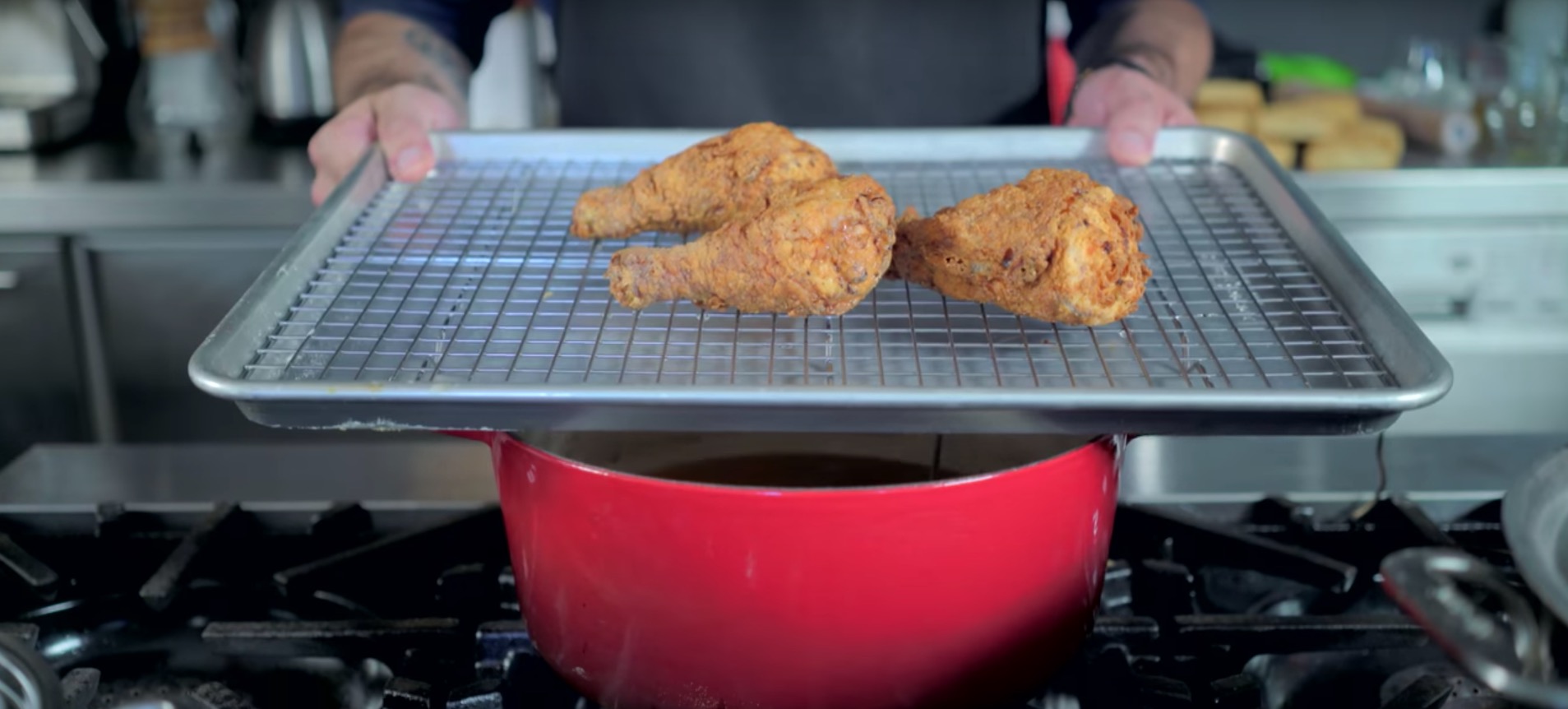 Voor deze video nam Binging with Babish de ingrediëntenlijst van Kentucky Fried Chicken eens grondig onder de loep. Dat resulteerde in een lijstje van maar liefst 11 kruiden die nodig zijn voor je gefrituurde kip: zout, tijm, basilicum, oregano, citroenzuur, zwarte peper, witte peper, gemalen mosterdzaad, paprikapoeder, knoflookzout, gemalen gember en witte peper. En o ja, smaakversterker MSG (ook wel bekend als ve-tsin of mononatriumglutamaat) als geheim ingrediënt.