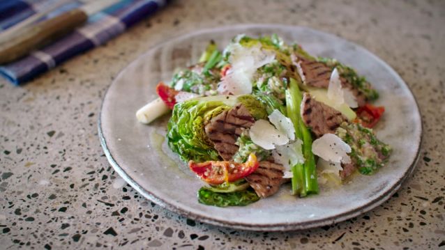 De basis wordt gevormd door een snelle biefstuk, die je door je slager dun kunt laten slaan zodat -ie heel snel gaar is. Je marineert deze kort in olijfolie, balsamico, knoflook en wat verse takjes rozemarijn. Deze marinade gebruik je ook voor de bosui en de romaine sla, die ook kort en heet gegrild worden.