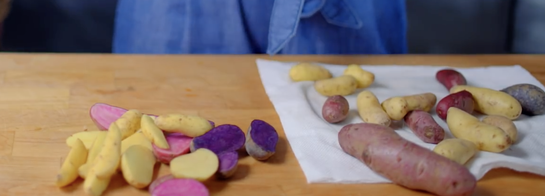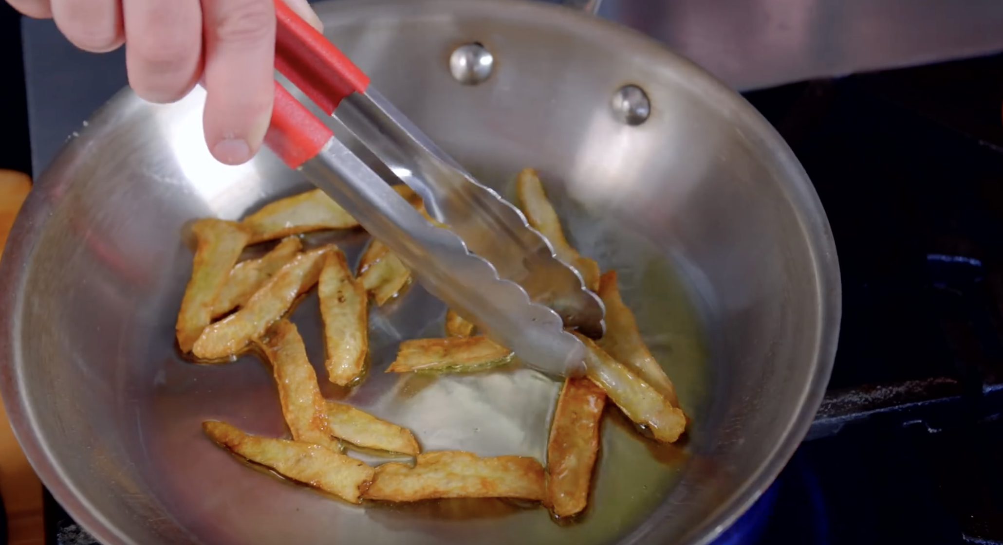 Door aardappelschillen met een laagje olie te frituren in een pan, worden ze crispy en ‘chips’-achtig. Heel geschikt om mee te garneren dus. Dit past vooral goed bij gerechten waar al aardappel in zit. Een foodstyling-trucje dat ook nog eens verspilling tegengaat.