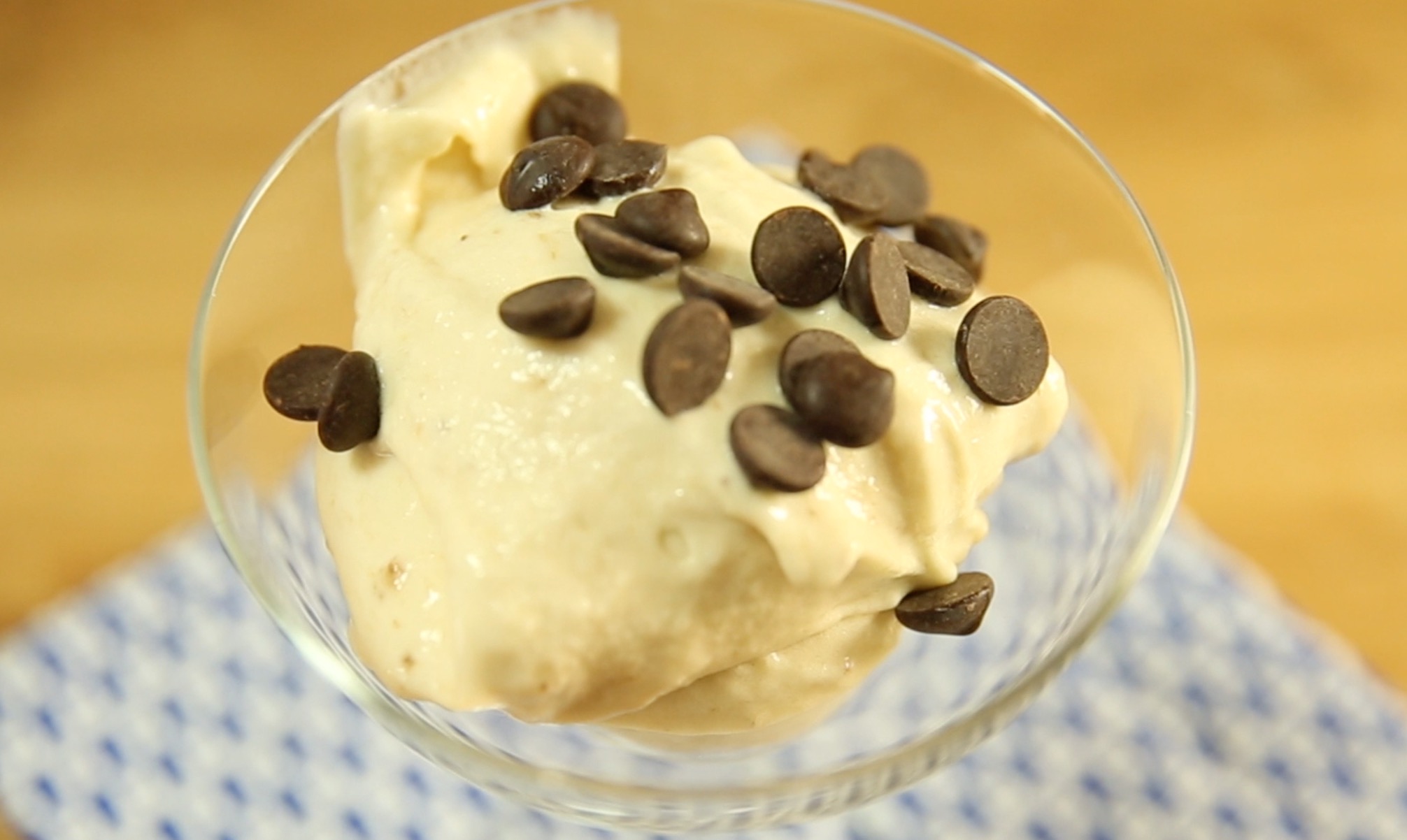 Schil een dag van tevoren 3 bananen, snijd in plakjes en doe in de vriezer. Blend de bananen ongeveer 3 minuten in de blender of keukenmachine. Voeg eventueel een scheutje melk toe om de bananen op gang te helpen. Serveer met chocolate chips!